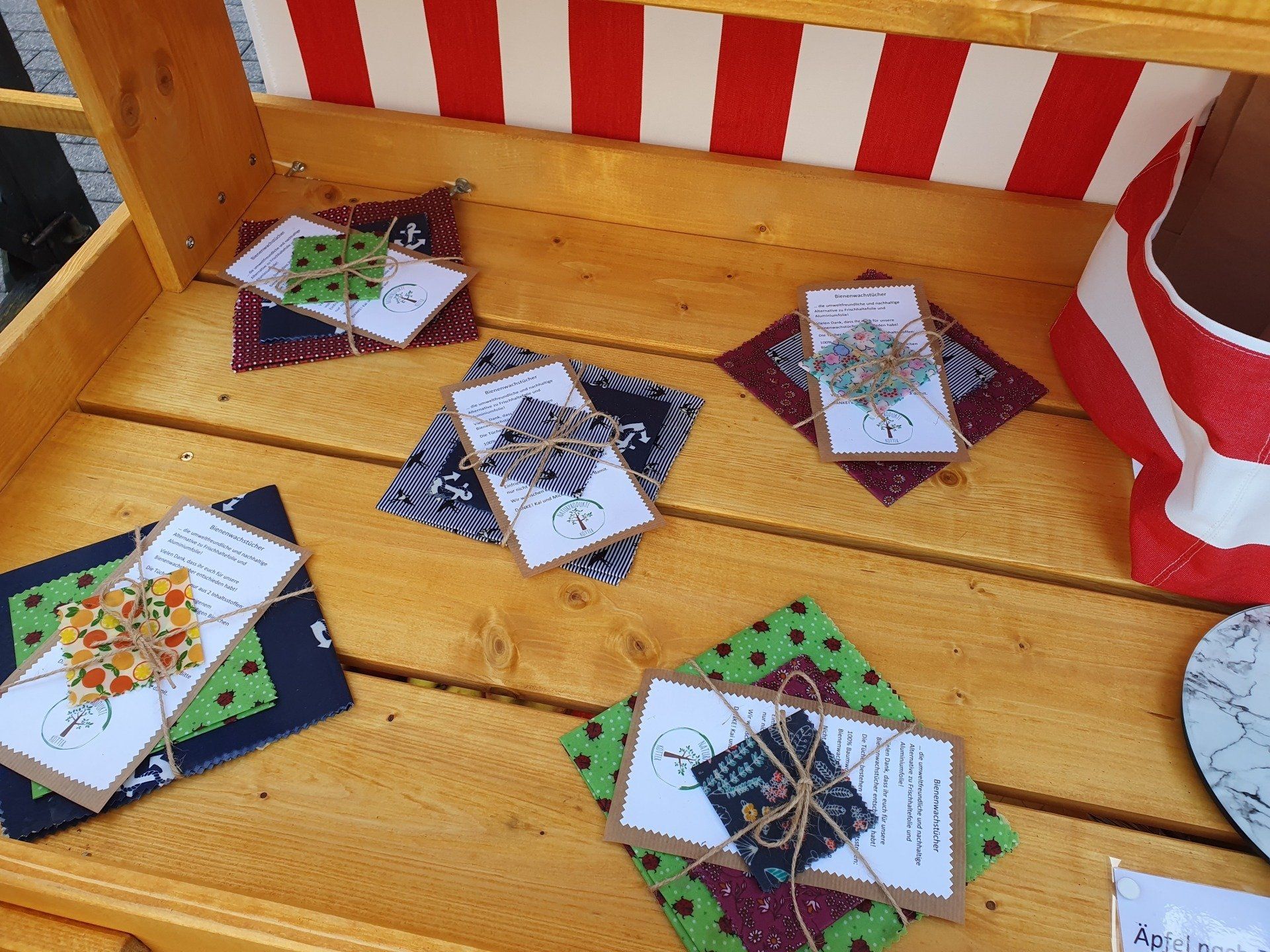 Wir verkaufen unsere Bienenwachstücher in schönen bunten 3er Sets. Ein Set besteht aus einem Tuch in der Größe S (15x15 cm), einem Tuch in der Größe M (25x25 cm) und einem Tuch in der Größe L (35x35cm). Das Tuch in der Größe S eignet sich beispielsweise um eine angeschnittene Gurke abzudecken, das Tuch der Größe M kann hervorragend zum Abdecken von Schüsseln oder Tellern verwendet werden und mit dem Tuch in der Größe L können Töpfe abgedeckt oder Brotlaibe eingepackt werden.